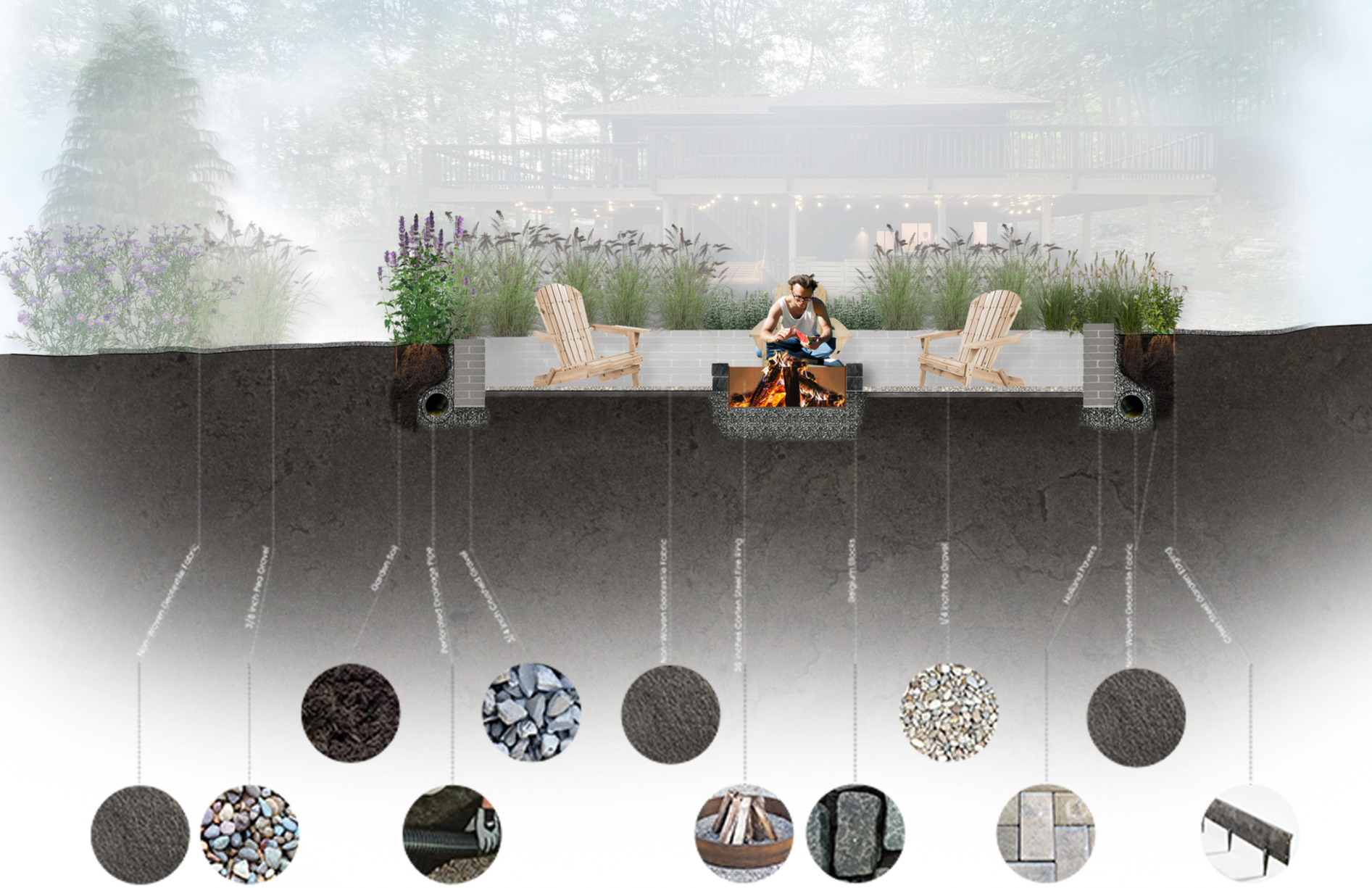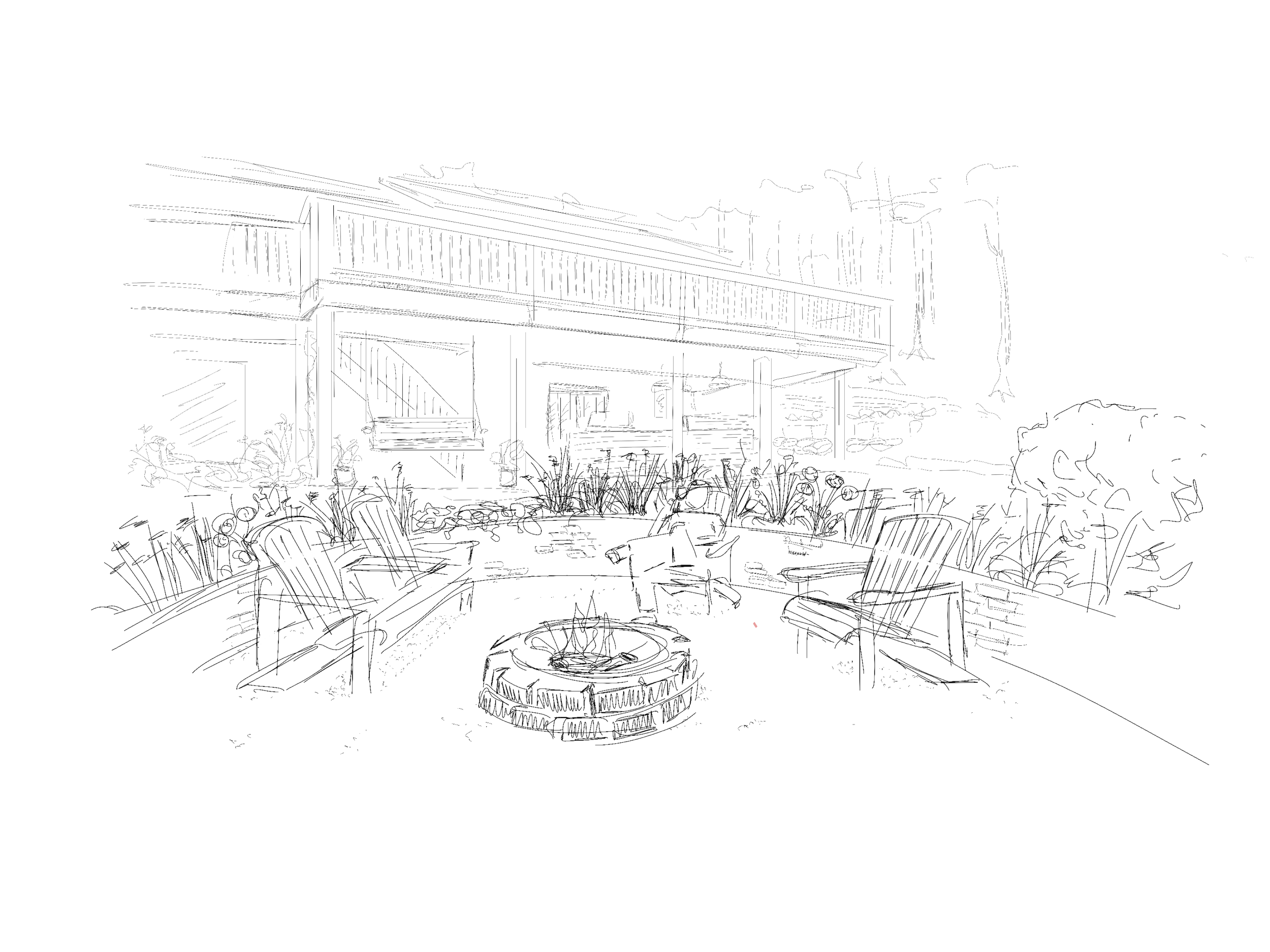 Set into a gentle slope, this sunken fire pit area was designed to create an inviting, sheltered outdoor space that encourages gathering while blending naturally with the woodland surroundings. The circular layout is framed by a dynamic planting palette—ornamental grasses, seasonal perennials, and structural shrubs—paired with strategically placed boulders to enhance visual interest and spatial definition. A restrained material palette of gravel, stone, and wood reinforces cohesion with the broader landscape. Careful grading and planting ensure seamless integration, year-round usability, and a low-maintenance, immersive experience.