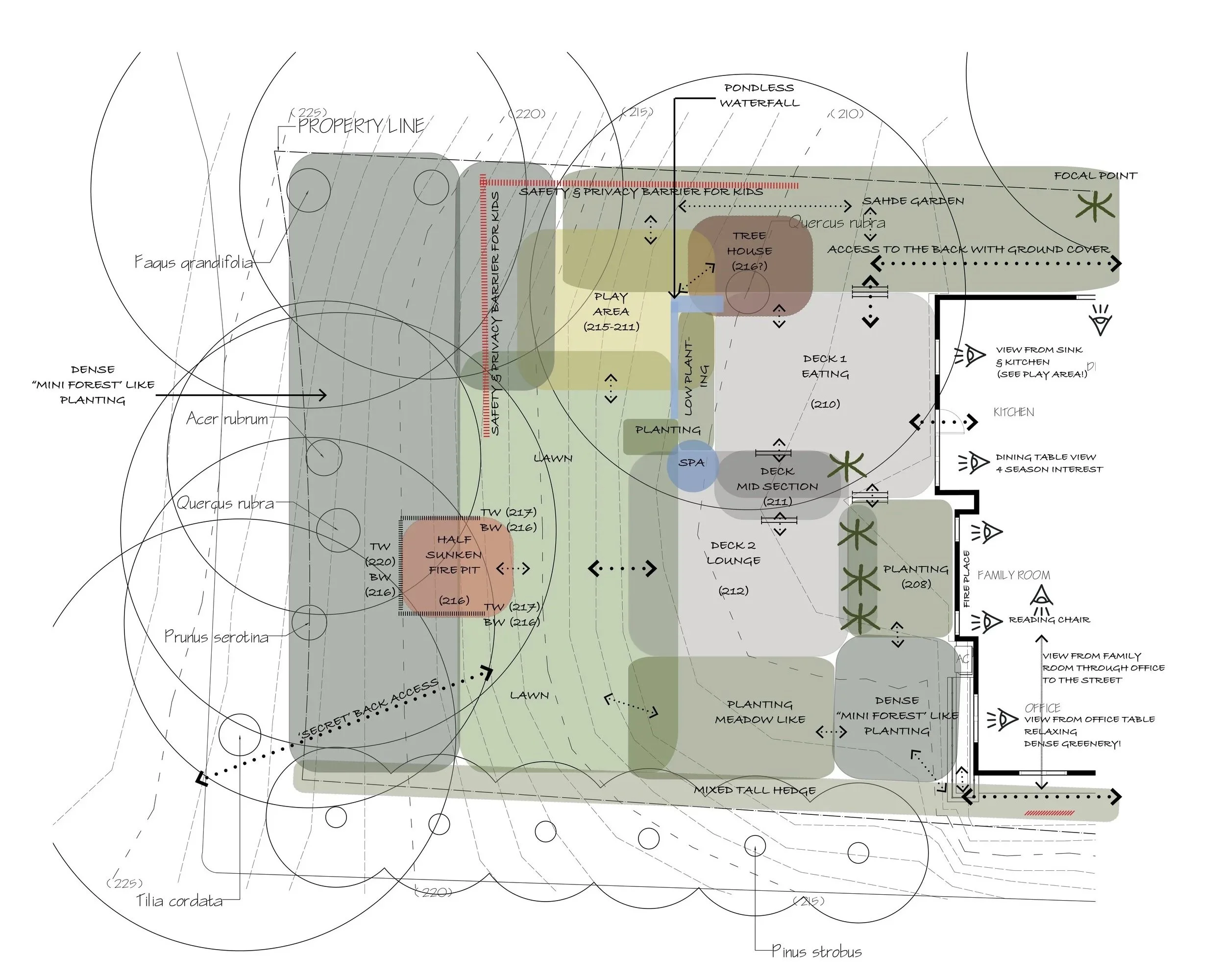 This design reimagines a traditional Tudor-style home in New York as a warm, family-oriented landscape that blends structure, texture, and nature. The concept emphasizes functional outdoor “rooms” that adapt to the family’s everyday life — from a cozy woodland fire lounge and a treehouse adventure zone to a spa retreat and a reflective stream.